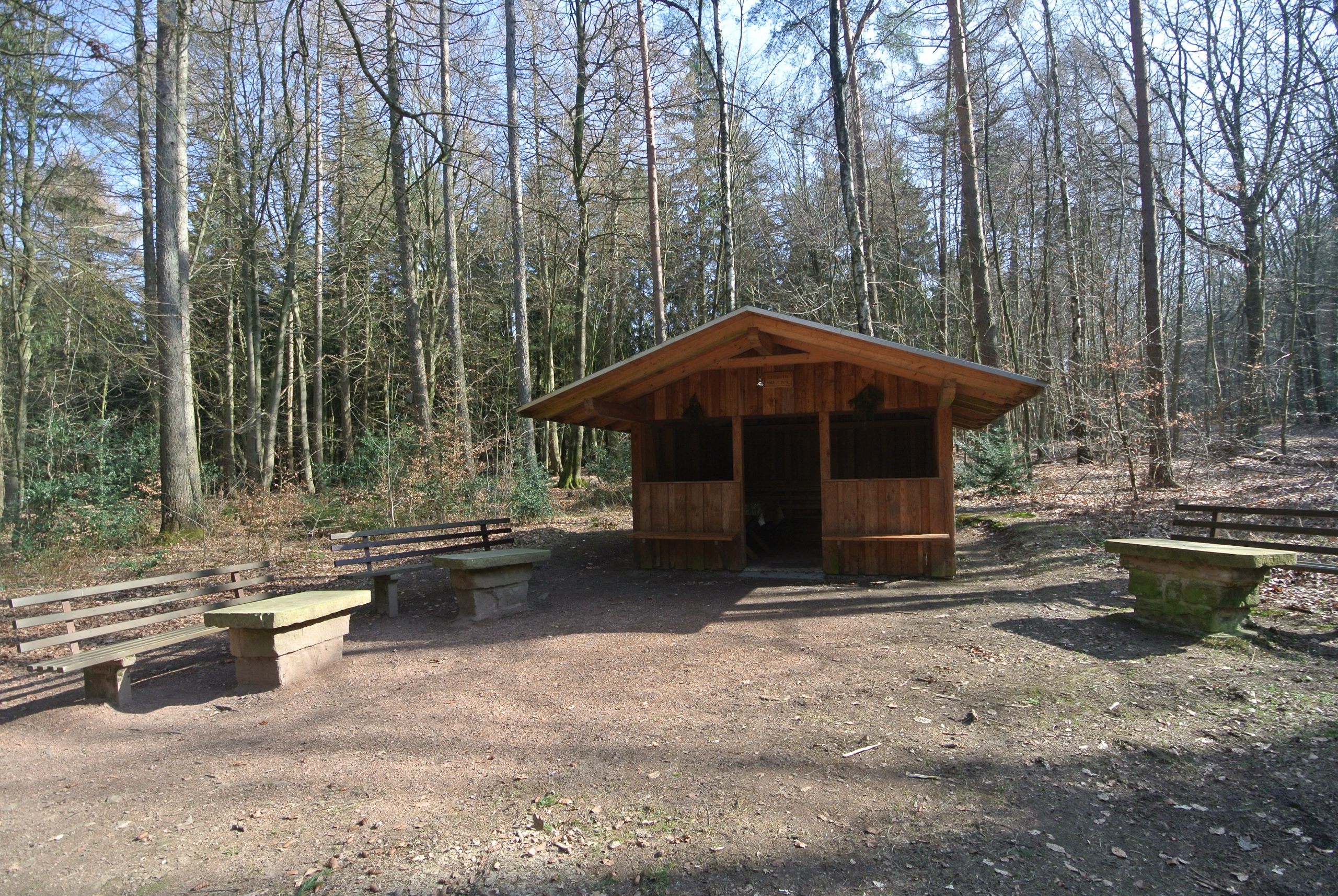 Offene kleine Schutzhütte im Wald gelegen mit Sitzmöglchketen und Tisch. Guter Zwischenstop für eine Waldwanderung. Von hier aus lassen sich auch klasse Spazergänge und Wanderungen in allerlei Richtung durch den Wald organisieren.