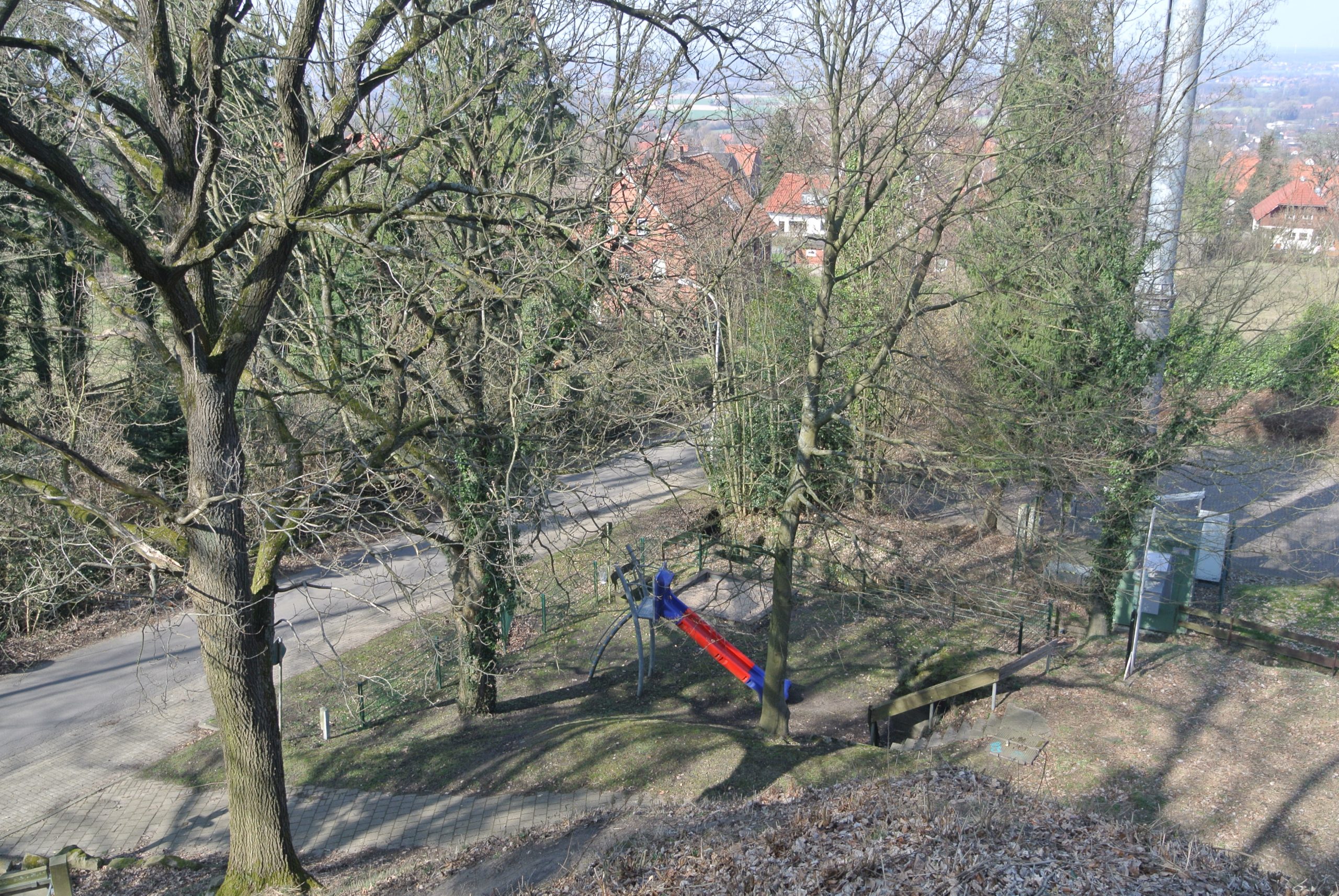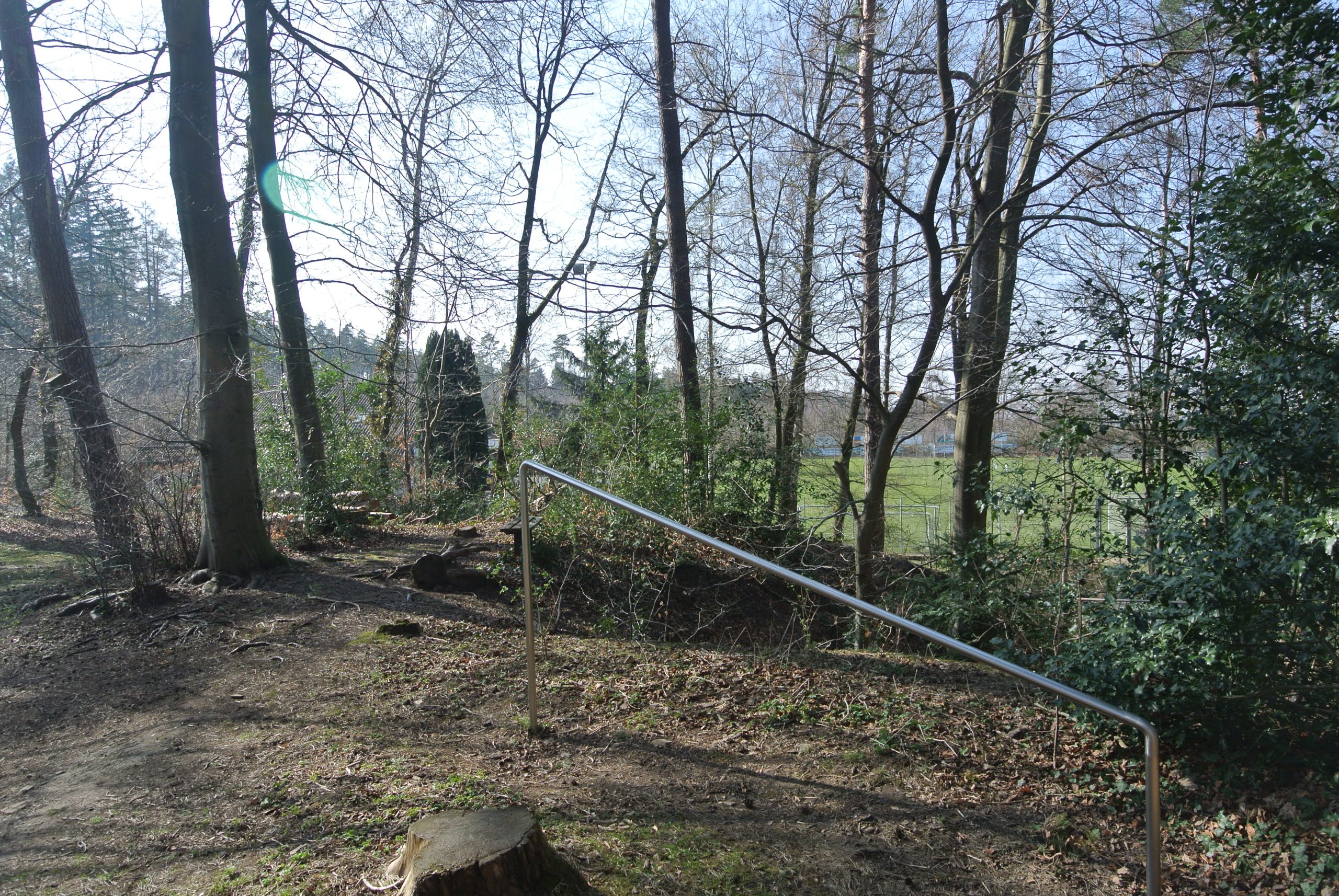 Entweder vom Parkplatz über den Weg ’neben dem Weg zum Wildtiergehege‘ – oder direkt von dort aus entlang des oberen Randes des Wildtiergeheges – und dort am Ende dann ‚rechts bergan‘ zu erreichen. Auch im angrenzenden Bach kann toll gespielt werden. - NABU Erlebnispfad & Birkenhöhe